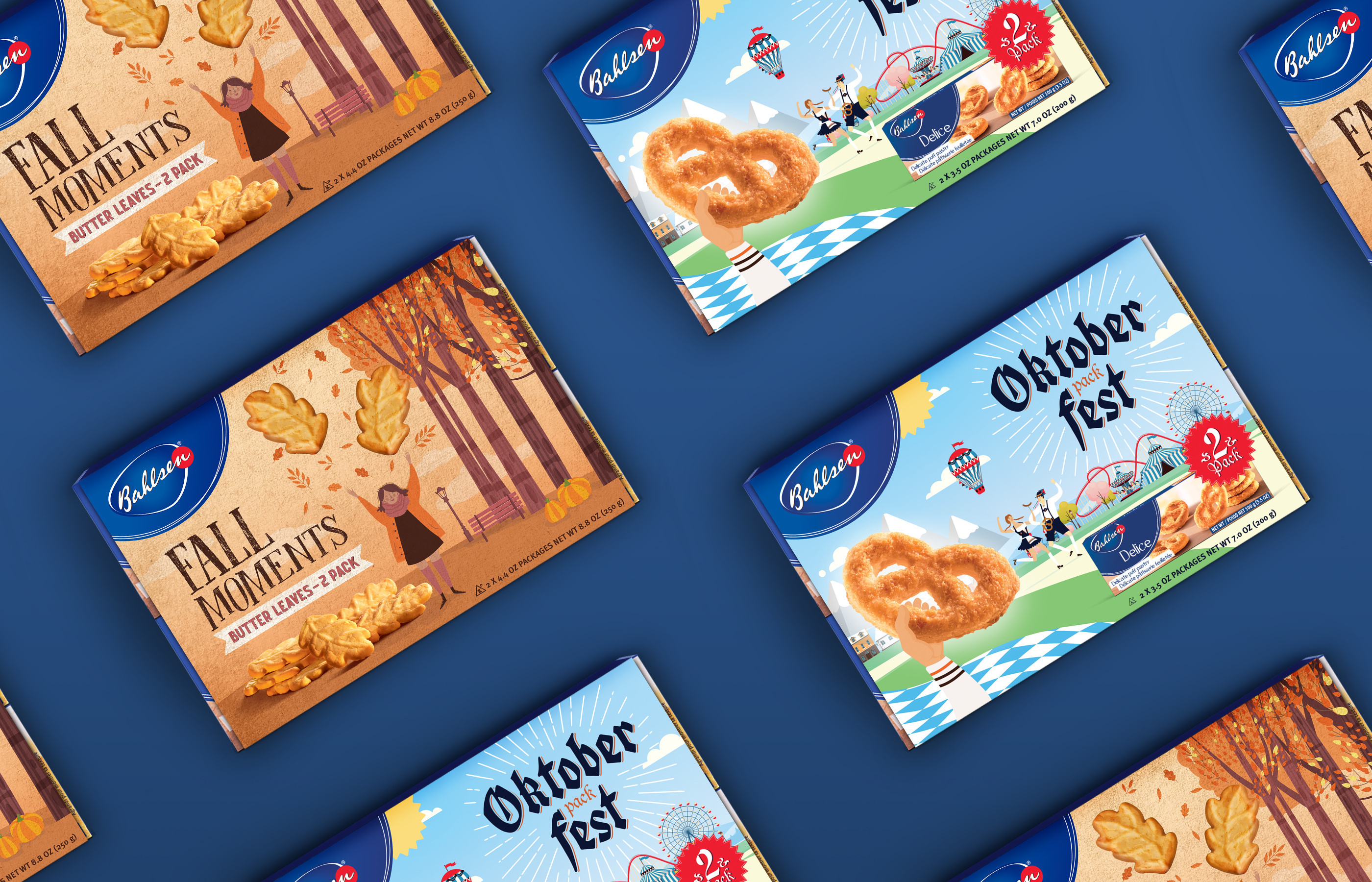 “Fall Moments” is an illustrated celebration of the fall season. The two-pack features Bahlsen’s traditional Butter Leaves cookies, which come alive in the illustration as real-life fallen leaves on the cozy park landscape that embellishes the frame. The warm hues of orange and brown complement the Bahlsen’s on-brand signature navy blue.
