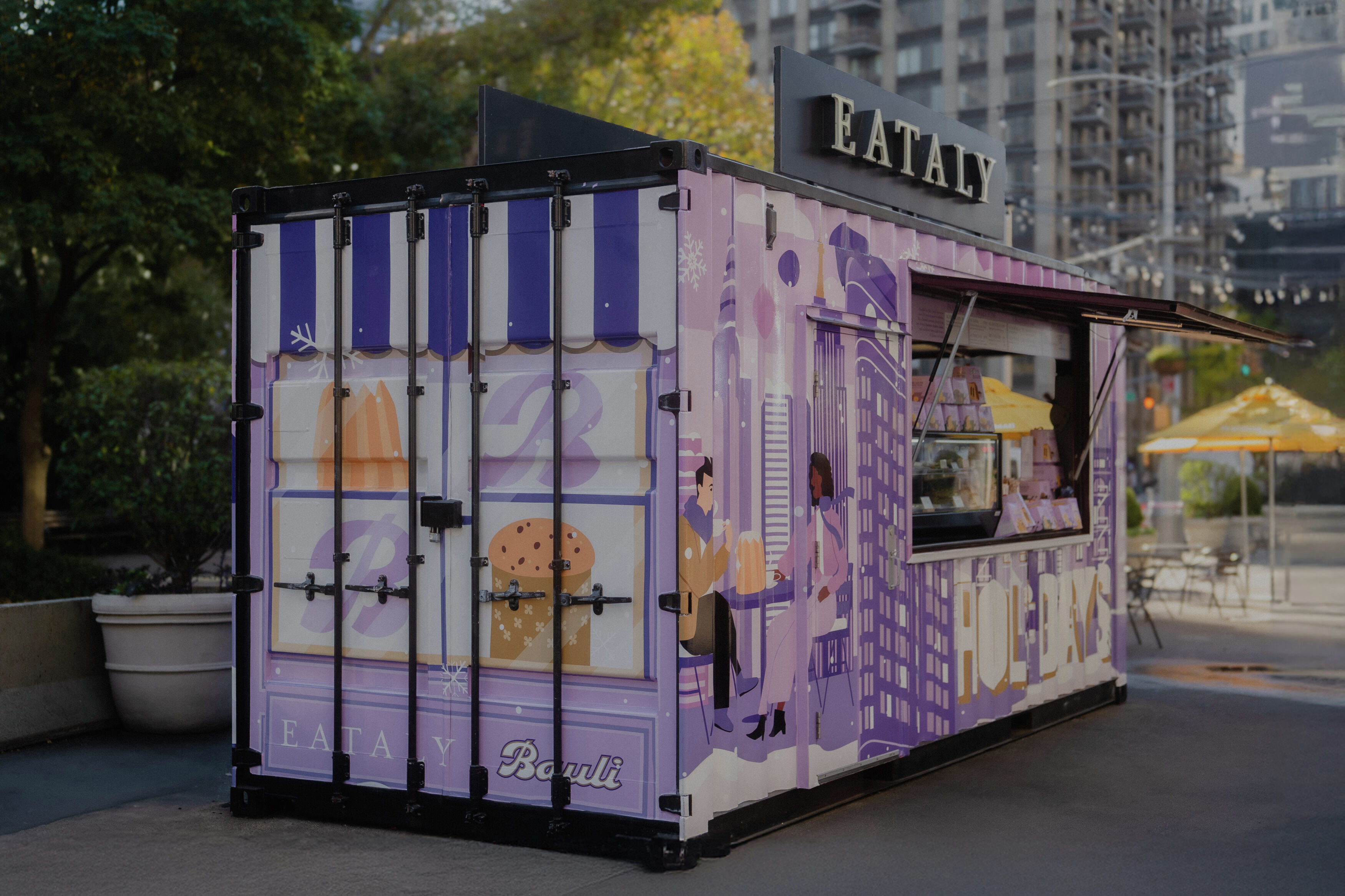 To bring the warmth and tradition of Italian holidays to the heart of NYC, Bauli and Eataly Flatiron partnered with QNY Creative to transform the iconic Eataly kiosk into a festive showstopper. Our custom-designed wrap turned the container into a vibrant celebration of Bauli’s signature holiday treats—think Pandoro, Panettone, and pure Italian indulgence.