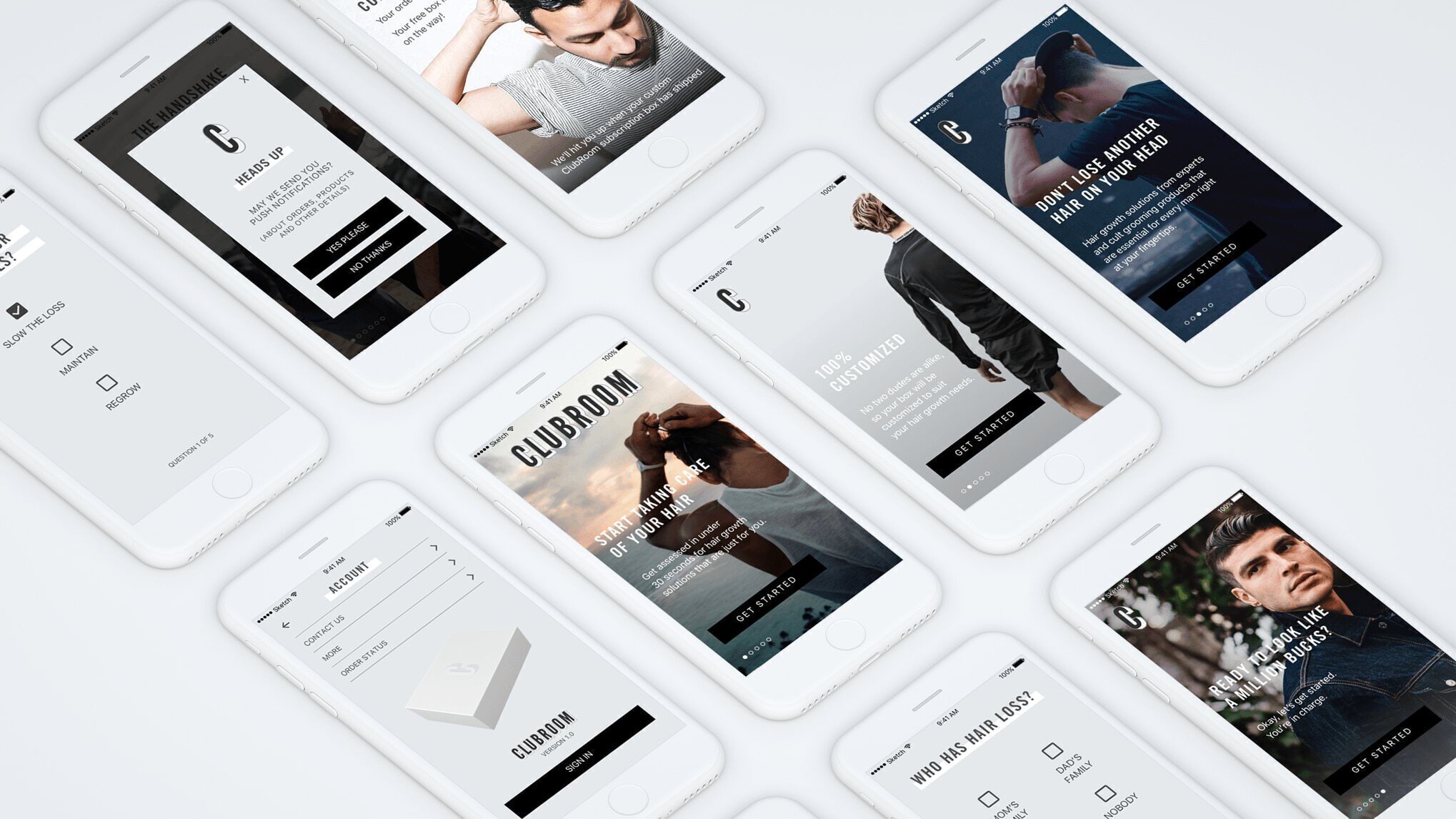Simple and straightforward was at the center of our brand concept. We brought this into our copywriting, app design and user interactivity, and packaging design. The app includes a quick quiz to assess the user’s needs and formulates a specific combination of products to combat hair loss. Every step of this design, from app screens to Minoxidil bottle packaging, incorporated the Clubroom Man’s witty personality without losing sight that this is a sensitive subject and a real issue for many men. The user-friendly app and honest packaging helps us connect with any user, no matter their age or hair loss concerns.