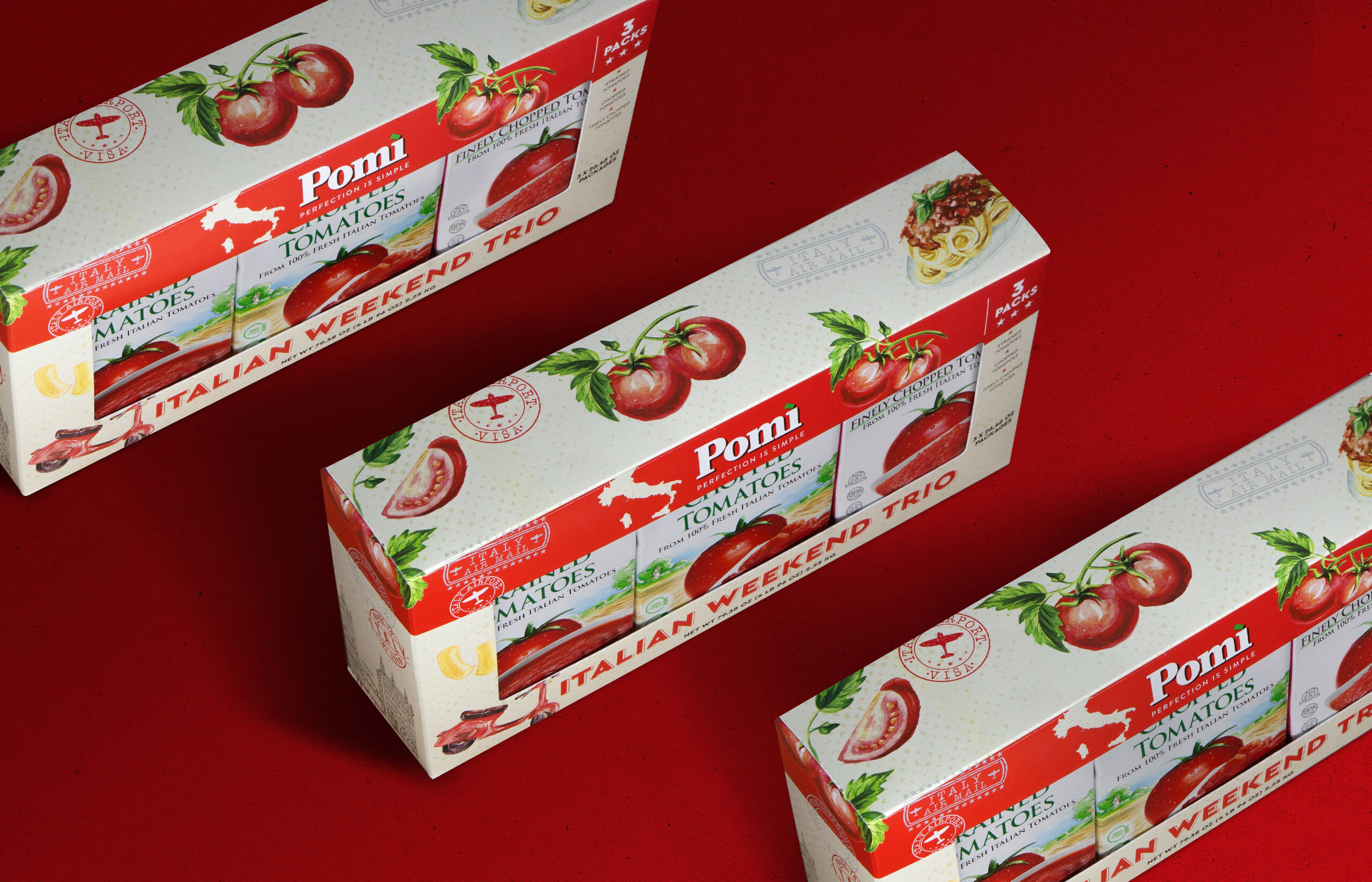It was this concern that Pomì USA saw to address through a revolutionary launch for the company: The Italian Weekend Tomato Trio. The tomato sauce giant came to QNY Creative to design an alluring pack for its boxed tomatoes variety pack, one that would be safe to purchase online but would evoke Pomì’s Italian origins by inviting consumers to travel back to Europe in one simple bite.